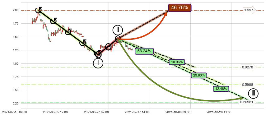 从2021-07-21 09:00至2021-08-24 09:00,共包含154个小时,阶段股价下跌-37.54%,阶段股价变动位移路程比: 1 : 5,下跌趋势角度: 48.3