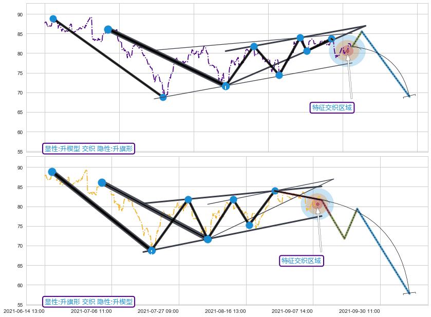 ➣ 升旗形:猜想临近关键支撑位突破点 → 临近拐点下跌 → 风险信号 → 大趋势均值回复
