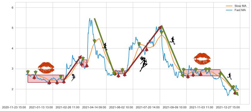 04-28 12:00至05-14 13:00 慢线与快线多次接触,存在上下穿越,有缠绕