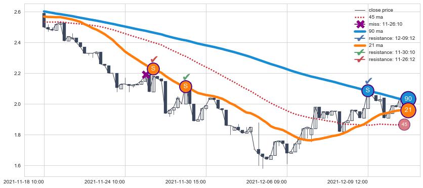 📝 多条均线形成死叉后走势最低价格达到: 1.6400