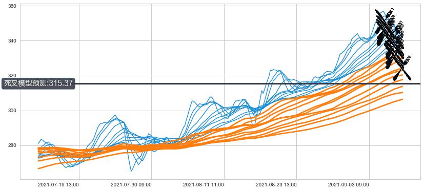 ➢ 30小时均线于(09-07 14:00: 345.31)形成【死叉】基于【死叉历史模型】预测死叉后最低波谷价格: 331.49, 死叉后最低价格322.28,已经下跌超出预测最低波谷价格, 预期反弹