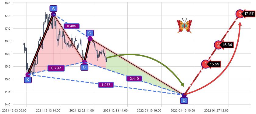 ➣ 未完成【蝴蝶】形态起点X: 12-03:11, 已到达C点: 12-21:12, 预测最终D点: 01-17:10, 共232交易小时