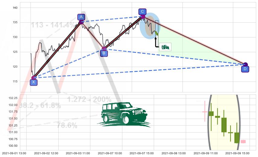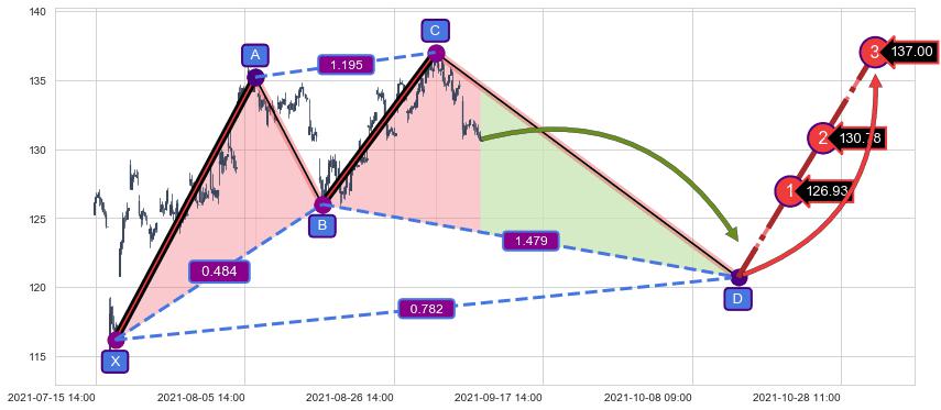➣ 谐波蝙蝠:d上涨已到达第❸目标:猜想阻力下沉 → 下跌 →【拐点】风险信号 → 大趋势均值回复