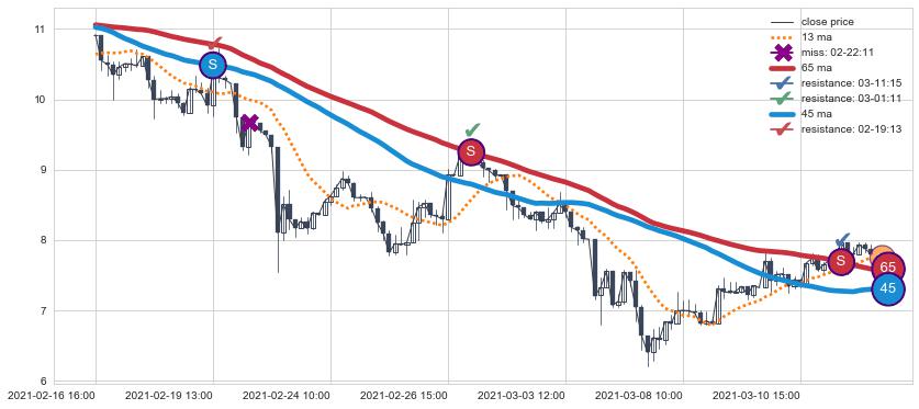 ➣ 45小时均线于(06-17 09:00: 7.01)形成【死叉】基于【死叉历史模型】预测死叉后最低波谷价格: 6.12, 死叉后最低价格5.39,已经下跌超出预测最低波谷价格, 预期反弹