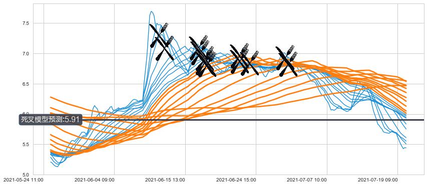 ➣ 70小时均线于(06-23 10:00: 6.95)形成【死叉】基于【死叉历史模型】预测死叉后最低波谷价格: 5.74, 死叉后最低价格5.39,已经下跌超出预测最低波谷价格, 预期反弹