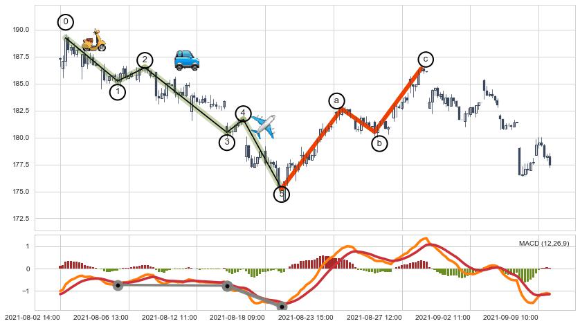➣ 波浪理论:猜想达到c点后小反弹终止反转下跌 → 下跌 → 【拐点】临近 → 阶段均值回复结束后继续大周期趋势跟踪