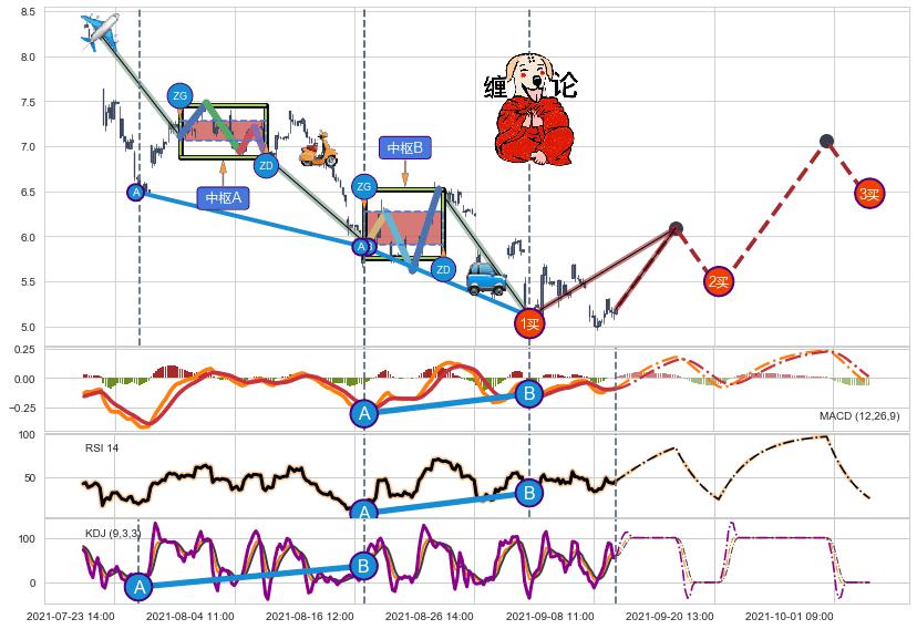 ➣ 缠论买卖点:下降缠中枢AB形成后猜想拐点1买已到达,猜想后续持续拉升(均值回复)