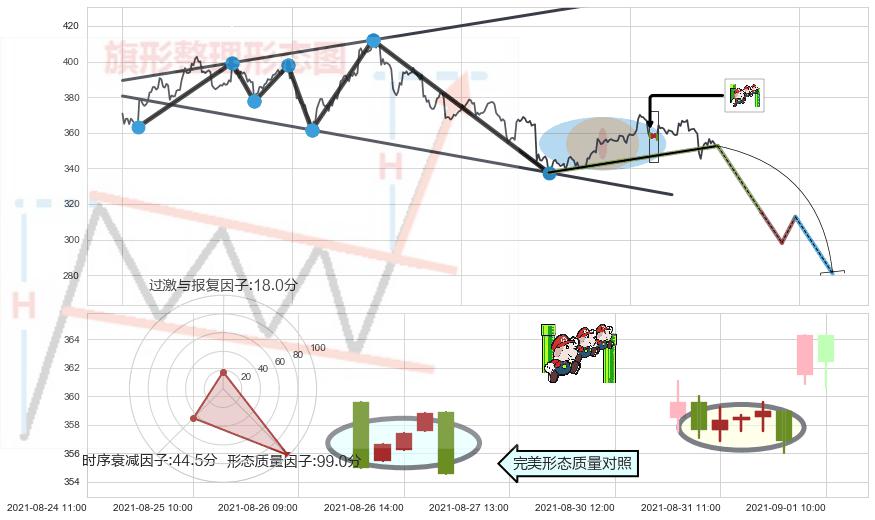 ➢ 🕰 价格走势在2021-08-31 10:00:00至2021-08-31 14:00:00期间形成下降三部曲(降势三鹤),残存影响值:-3.56