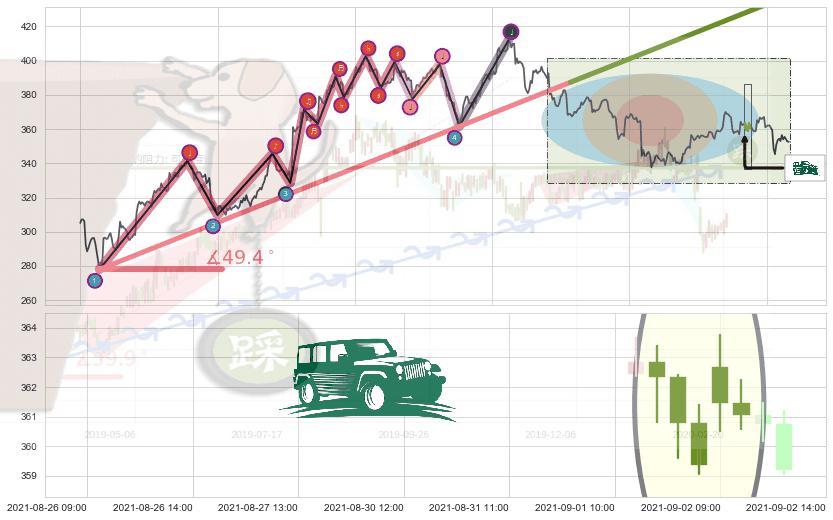 ♘ 阻力价格位397.21,可信任强度96.93%,距离最后交易2021-09-09 14:00形成的收盘价格352.59相差 +12.66%