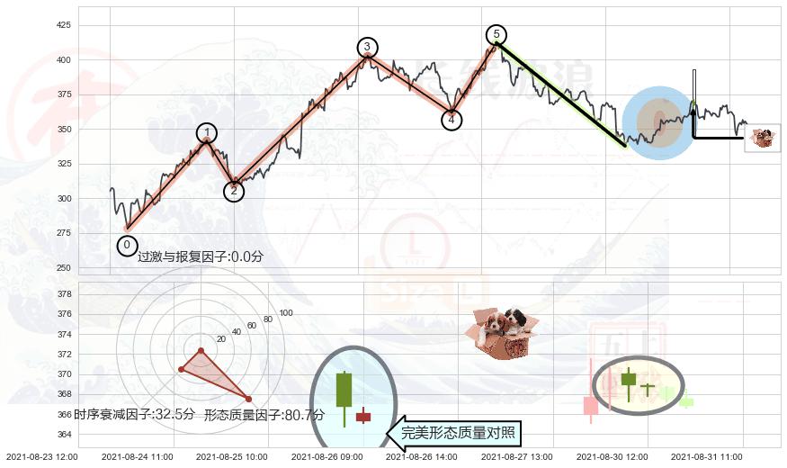 从2021-08-03 12:00至2021-08-13 11:00,共包含48个小时,阶段股价下跌-0.06%,阶段股价变动位移路程比: 1 : 384