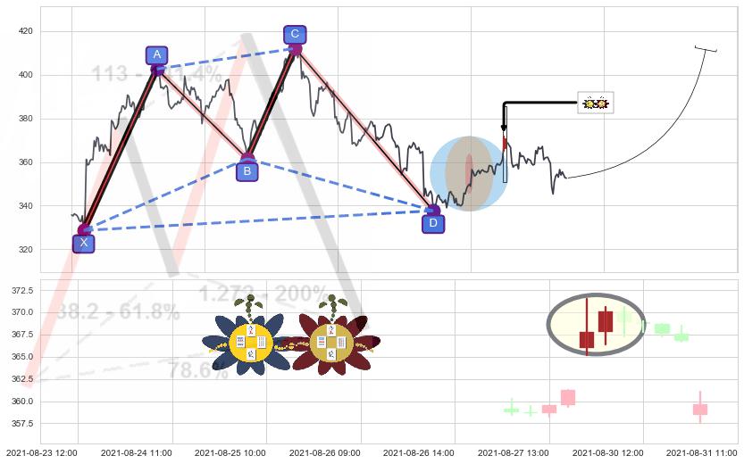 ➣ 谐波赛福:c下跌到达d:猜想拉升 → 上涨 →【拐点】强支撑临近 → 大趋势均值回复