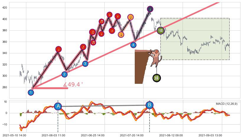 从2021-05-13 12:00至2021-07-07 15:00,共包含228个小时,阶段股价上涨34.88%,阶段股价变动位移路程比: 1 : 4,上涨趋势角度: 60.6