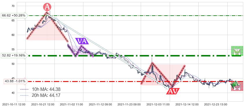 ♘ 支撑价格位43.88,可信任强度67.90%,距离最后交易2021-12-27 15:00形成的收盘价格44.33相差 -1.01%
