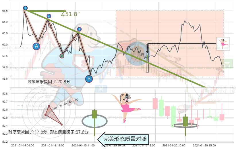 从2021-01-04 09:00至2021-01-21 13:00,共包含101个小时,阶段股价下跌-2.50%,阶段股价变动位移路程比: 1 : 10,下跌趋势角度: 51.8,2021-01-12 09:00向↘︎形成缺口,跳空下跌-1.41%˚