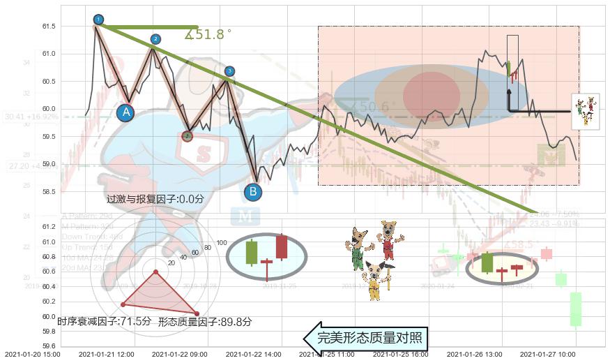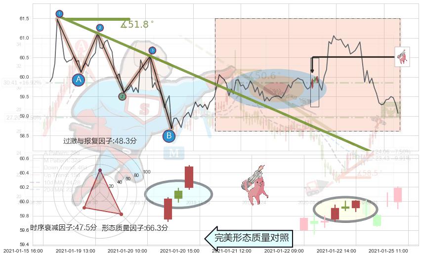 从2021-01-19 16:00至2021-01-28 16:00,共包含57个小时,阶段股价下跌-0.49%,阶段股价变动位移路程比: 1 : 25