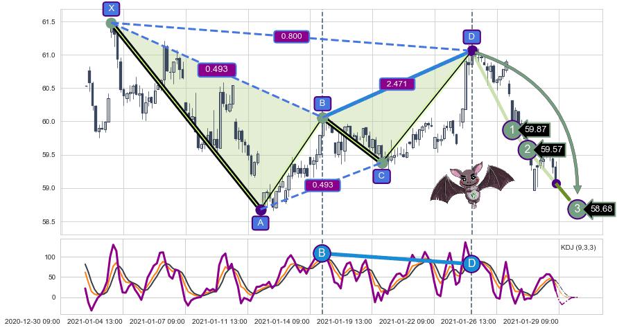 ➣ 已完成【蝙蝠】形态起点X: 01-04:09, 终点D: 01-25:13, 共117交易小时