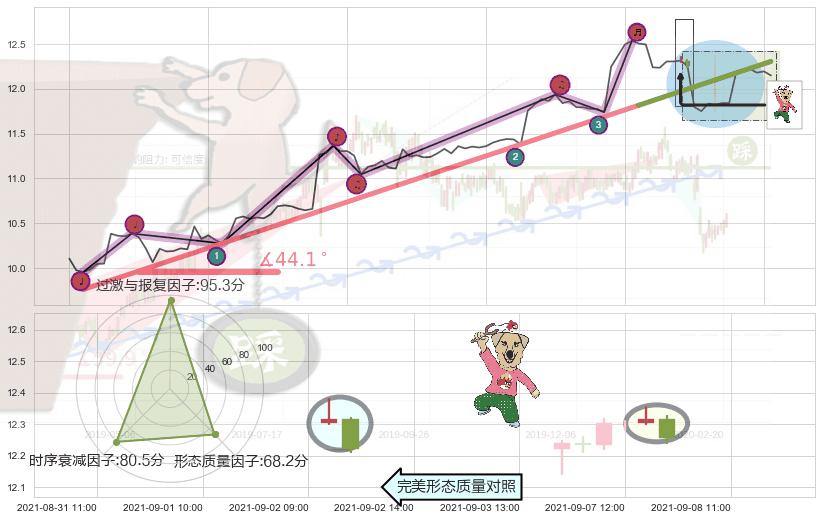 ➢ 2021-08-17 11:00-2021-09-03 13:00上升趋势存在反转[风险],虽然原上升趋势的支撑位(12.31)已破位,但其支撑效果尚存,原上升趋势角度: 44.1˚