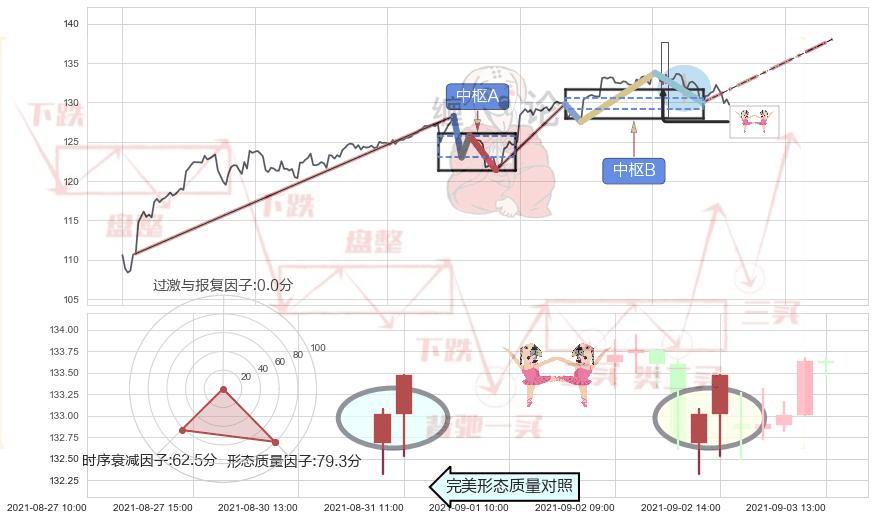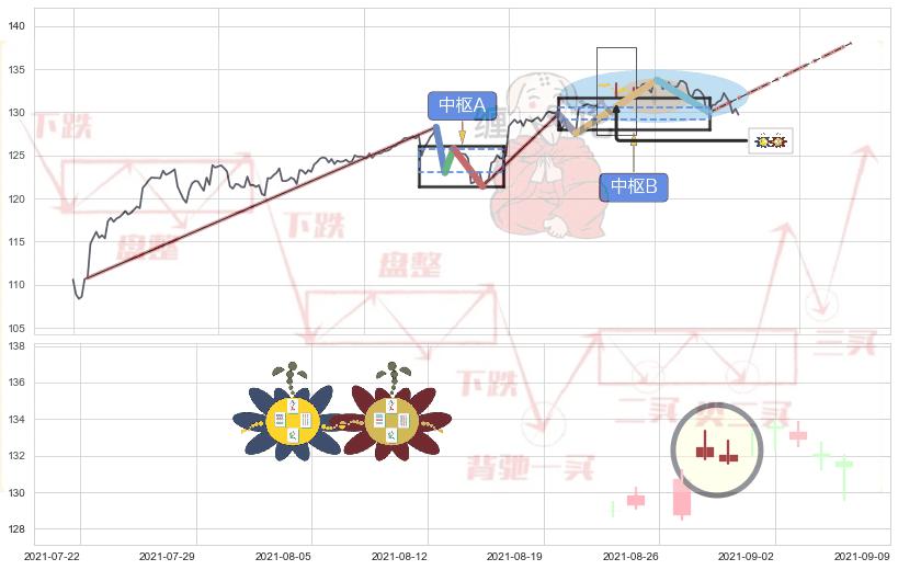 ➣ 【中枢B】:08-25:14-09-08:10,中枢由4笔构成,共53交易小时, ZG=129.99, ZD=129.80