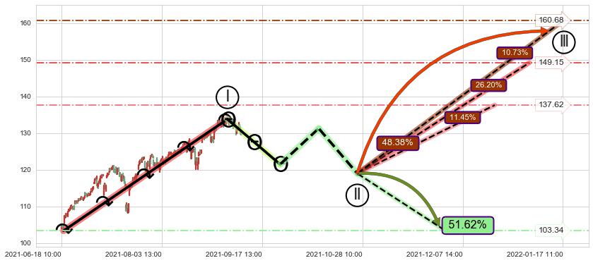 ➢ 高概率大级别循环上涨浪被破坏,反转向下(突破5浪起点)概率51.62%