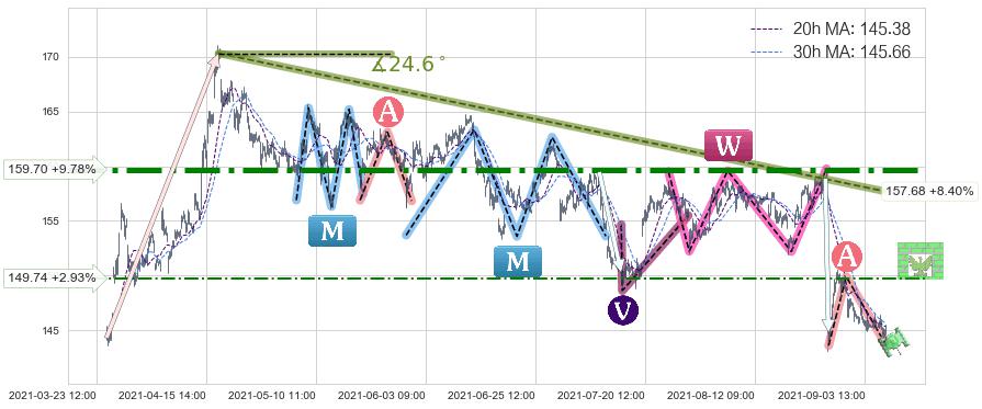 ♘ 阻力价格位159.70,可信任强度98.65%,距离最后交易2021-09-09 14:00形成的收盘价格145.47相差 +9.78%