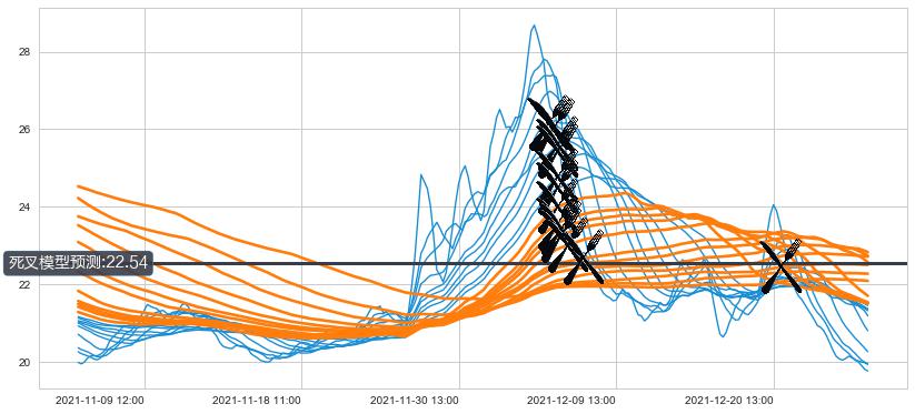 ➢ 120小时均线于(12-08 09:00: 22.66)形成【死叉】基于【死叉历史模型】预测死叉后最低波谷价格: 21.42, 死叉后最低价格19.70,已经下跌超出预测最低波谷价格, 预期反弹