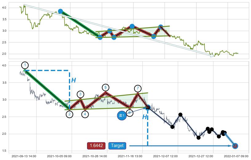 ➣ 升旗形:猜想预期下跌目标target即将达成,随后猜想强支撑来临,预期反弹上涨(均值回复)