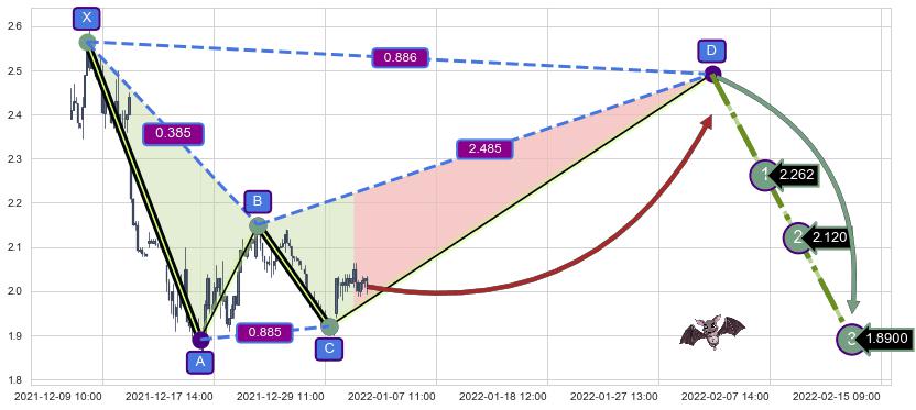 ➣ 谐波蝙蝠:b下跌接近c:猜想支撑性拉升 → 上涨 →【拐点】支撑临近 → 大趋势均值回复