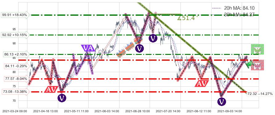 ♘ 阻力价格位86.13,可信任强度68.93%,距离最后交易2021-09-09 14:00形成的收盘价格84.36相差 +2.10%