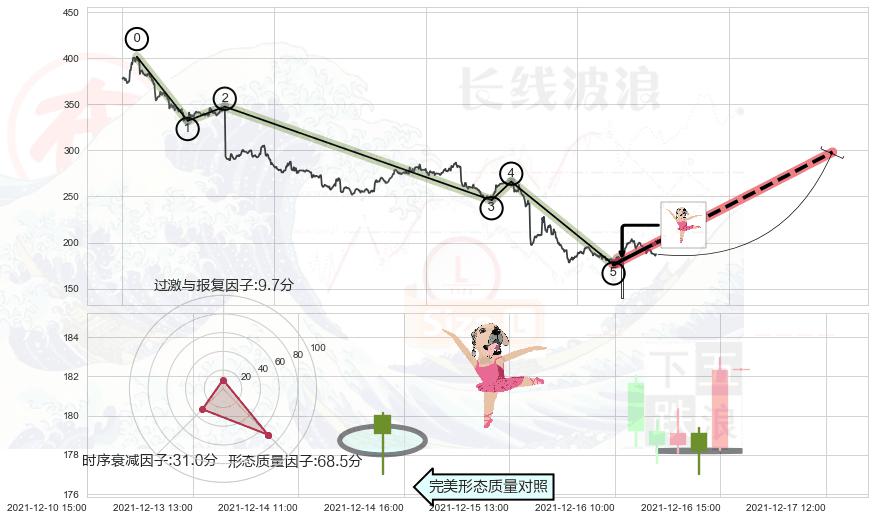从2021-08-05 11:00至2021-12-27 13:00,共包含684个小时,阶段股价下跌-70.19%,阶段股价变动位移路程比: 1 : 6,下跌趋势角度: 39.2,2021-08-31 09:00向↘︎形成缺口,跳空下跌-15.54%˚