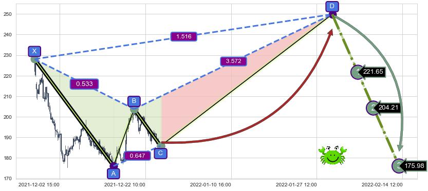 ➢ 谐波螃蟹:b下跌接近c:猜想支撑性拉升 → 上涨 →【拐点】支撑临近 → 大趋势均值回复