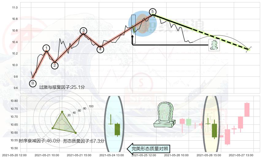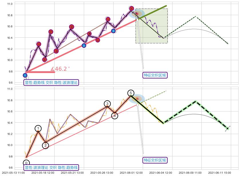 ➣ 2021-05-13 12:00-2021-05-28 15:00上升趋势存在反转[风险],其原上升趋势的支撑位(10.96)已破位[强阻力信号],原上升趋势角度: 46.2˚