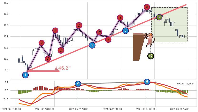 从2021-05-13 12:00至2021-05-28 15:00,共包含76个小时,阶段股价上涨10.48%,阶段股价变动位移路程比: 1 : 3,上涨趋势角度: 46.2