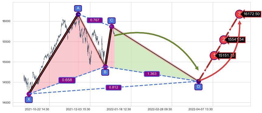 ➢ 距离预测D点位置有足够的下跌空间, 与看涨【伽利】形态相反,实际方向【看跌】
