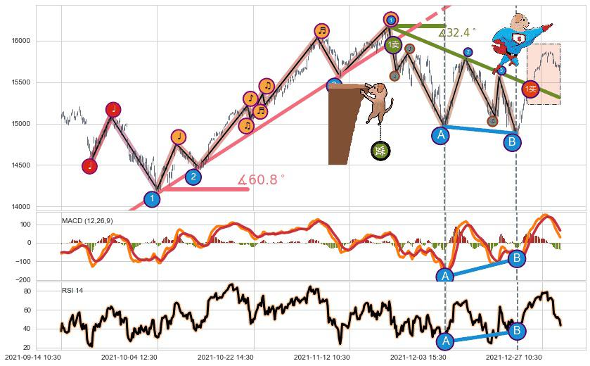 ➣ 2021-11-22 09:30-2021-12-27 14:30下跌趋势存在反转上涨[机会],其原下跌趋势的阻力位(15314.76)已被突破[强支撑信号],原下跌趋势角度: 32.4˚