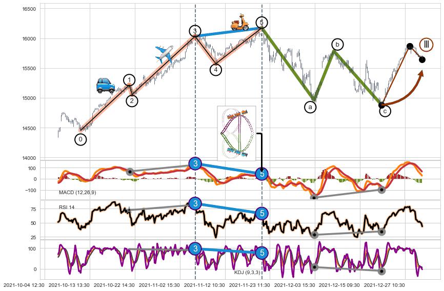 ➢ 1,3,5驱动浪MACD, RSI, KDJ走势都出现【常规背离】反转信号增强