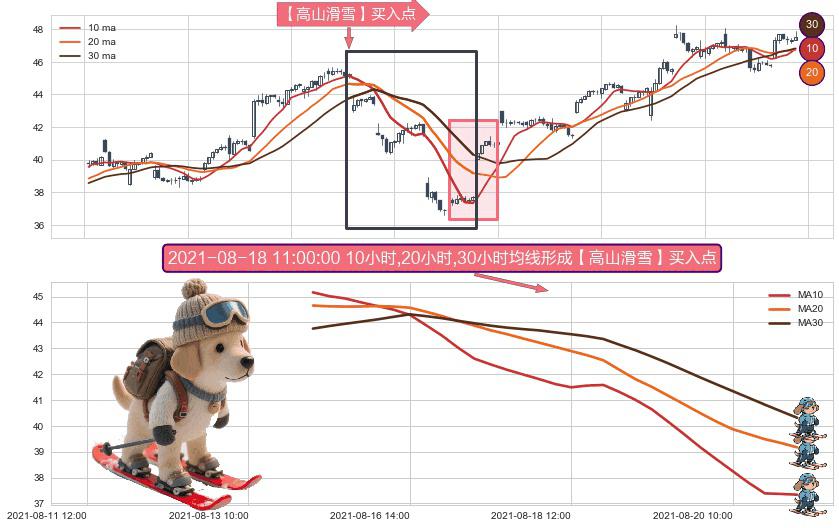 ⚀ 2021-08-13 14:00:00小时-2021-08-20 14:00:00小时显现 10小时-20小时-30小时均线 【高山滑雪】买入点 看多信号,后市看涨,买入
