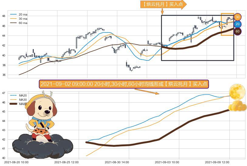 ⚀ 2021-08-26 09:00:00小时-2021-09-09 14:00:00小时显现 20小时-30小时-60小时均线 【烘云托月】买入点 看多信号,后市看涨,买入