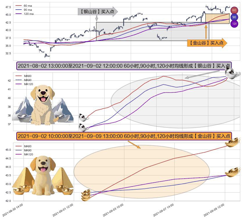 ⚀ 2021-09-02 11:00:00-小时至2021-09-09 13:00:00-小时显现 60小时-90小时-120小时均线 【金山谷】买入点 其再次确认了买入信号,可靠性更强,买入