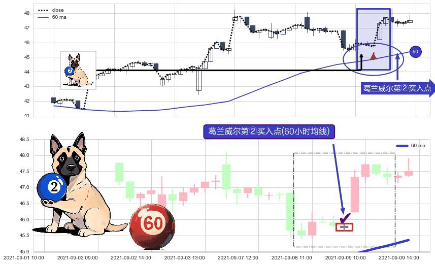⚀ 2021-09-08 14:00:00-小时显现 葛兰威尔均线 60小时均线 第②买入点 上升趋势的中继信号,后市看涨,买进信号