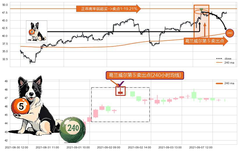⚀ 2021-09-02 09:00:00-小时显现 葛兰威尔均线 240小时均线 第⑤卖出点 上升趋势均值回复的短线回落信号,后市看跌,卖出信号