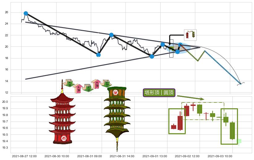 | 7 🅚:塔形底 | 圆底 ➕ ☯️:缠论买卖点下降缠:猜想2买趋势延续,蓄力上涨至3买(大周期趋势均值回复中的小周期趋势跟踪) ☞ 看多信号 ⇥ 【🅚线】交织【图形】⇥ 综合量化分数: 53 | > |