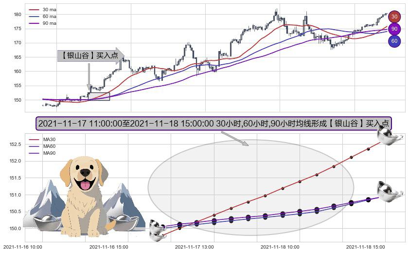 形态多维评估: ⚀ 2021-11-17 12:00:00-小时至2021-11-18 15:00:00-小时显现 30小时-60小时-90小时均线 【银山谷】买入点 看多信号,后市看涨,买入