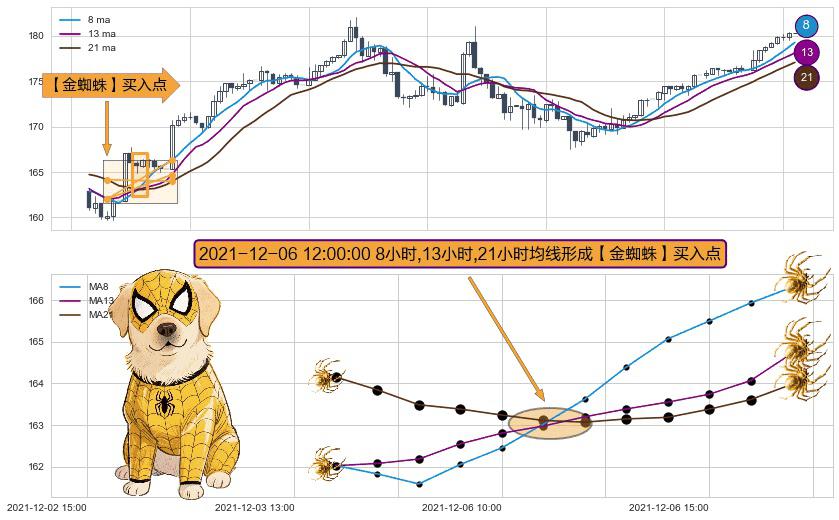形态多维评估: ⚀ 2021-12-06 12:00:00小时显现 8小时-13小时-21小时均线 【金蜘蛛】买入点 看多信号,后市看涨,买入