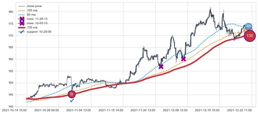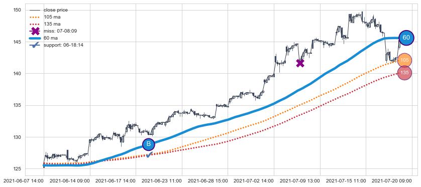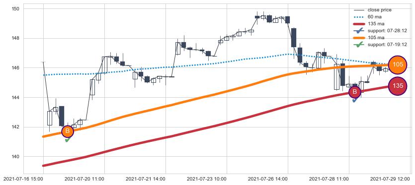 上涨趋势07-15 12:00-07-29 12:00,均线105, 135确认关键支撑2处