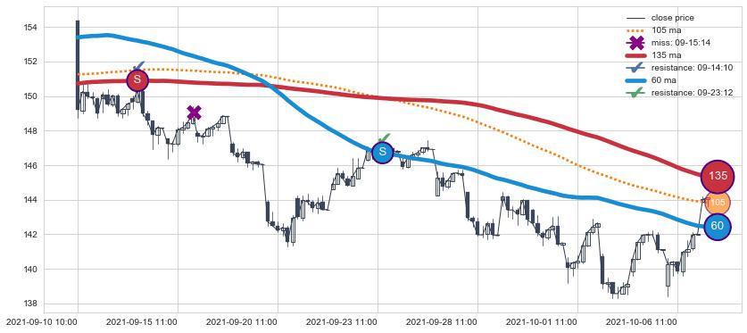 下跌趋势09-10 10:00-10-07 10:00,均线60, 135确认关键阻力2处