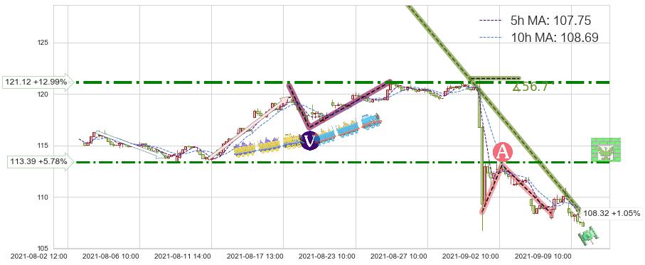 ♘ 阻力价格位121.12,可信任强度73.54%,距离最后交易2021-09-09 14:00形成的收盘价格107.20相差 +12.99%