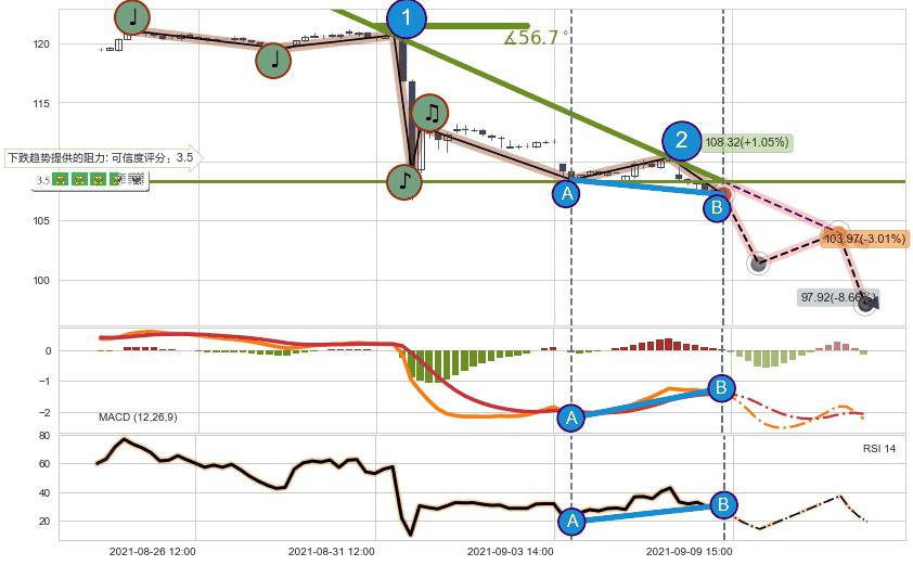 ➣ 预测:2021-09-13 13:00,【试探阻力】稳定目前下跌趋势的前提下,预测价格:103.97