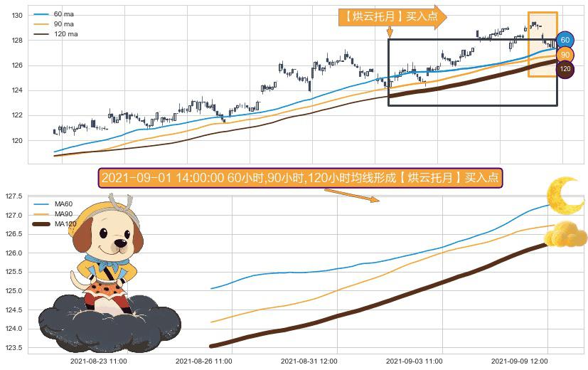 形态多维评估: ⚀ 2021-08-25 14:00:00小时-2021-09-09 14:00:00小时显现 60小时-90小时-120小时均线 【烘云托月】买入点 看多信号,后市看涨,买入