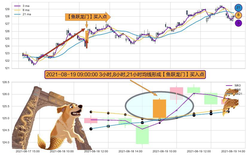 形态多维评估: ⚀ 2021-08-19 09:00:00小时显现 3小时-8小时-21小时均线 【鱼跃龙门】买入点 看多信号,后市看涨,买入