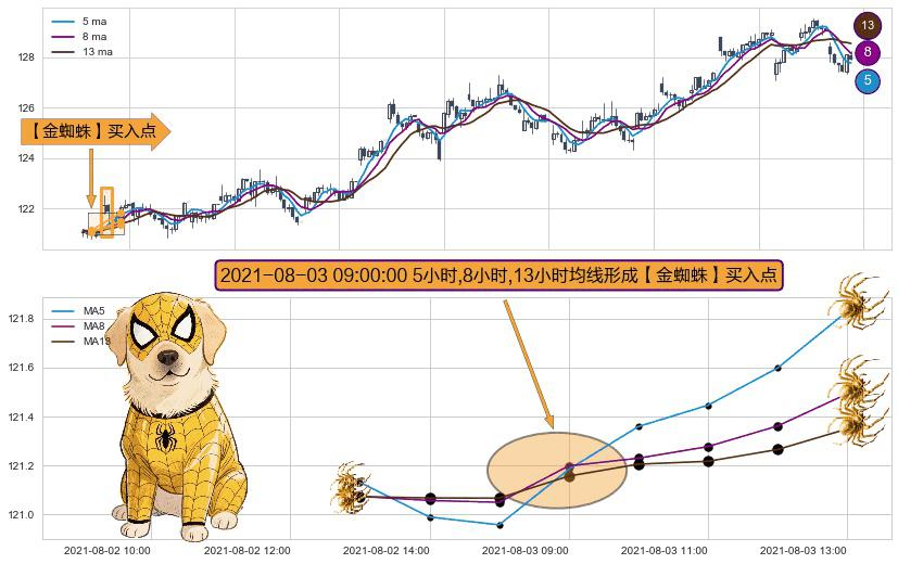 形态多维评估: ⚀ 2021-08-03 09:00:00小时显现 5小时-8小时-13小时均线 【金蜘蛛】买入点 看多信号,后市看涨,买入
